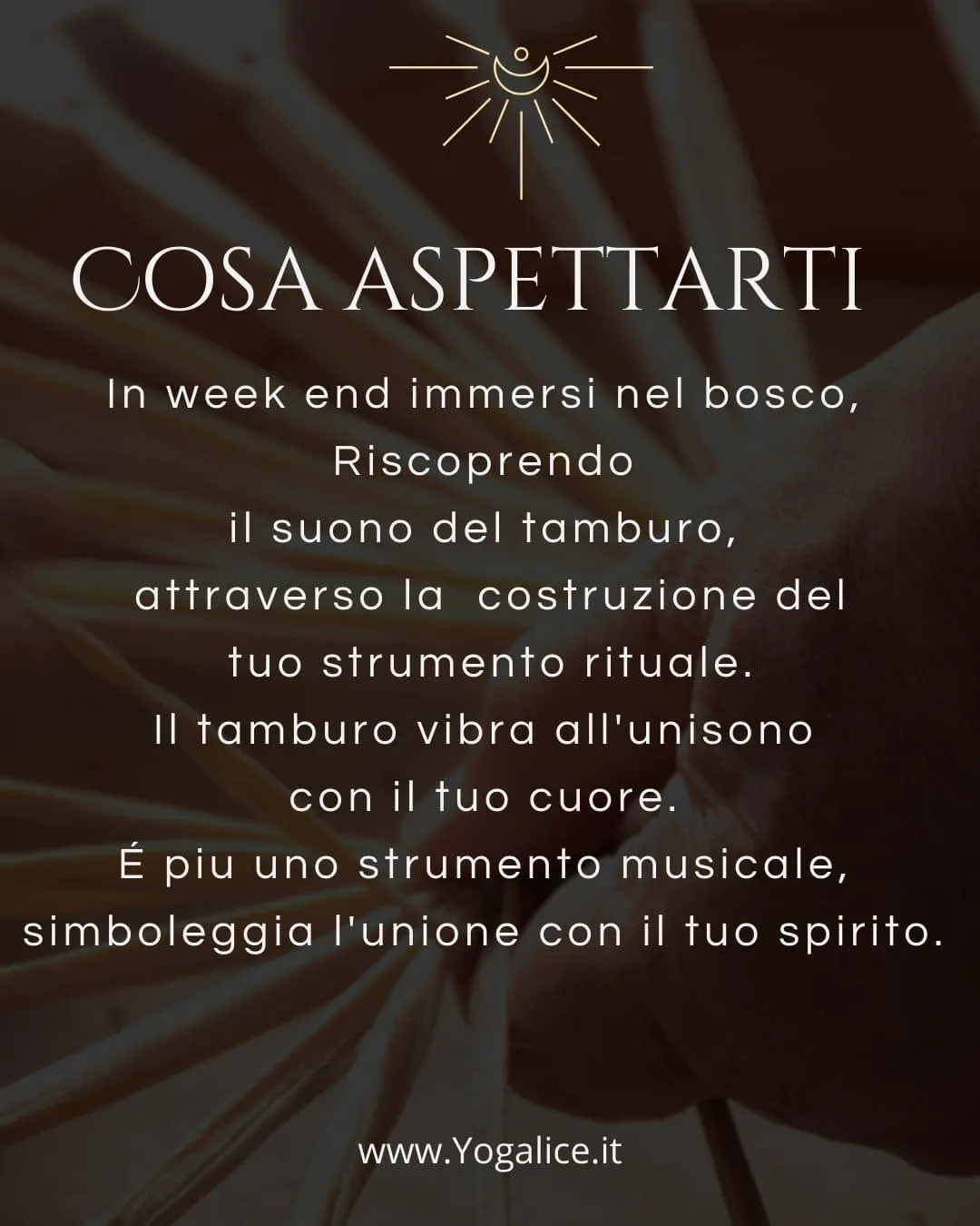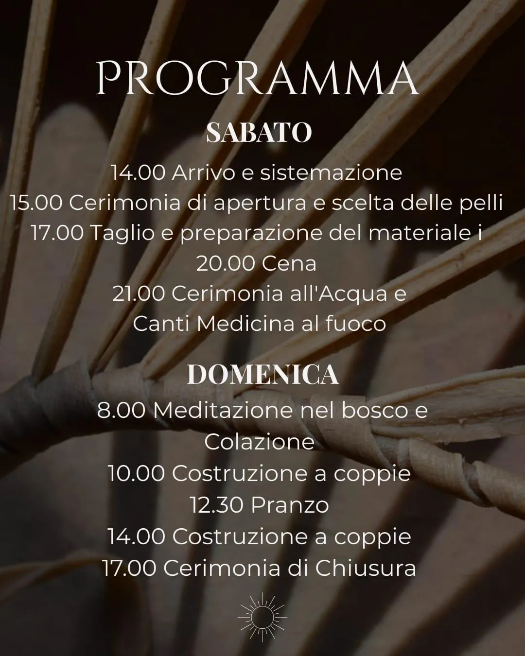 Durante il week end saremo immersi nella natura, lavorando passo dopo passo alla costruzione del tuo tamburo sciamanico: dalla scelta e preparazione delle pelli, al montaggio sul cerchio, fino alla creazione del batacchio personalizzato con i tuoi amuleti.